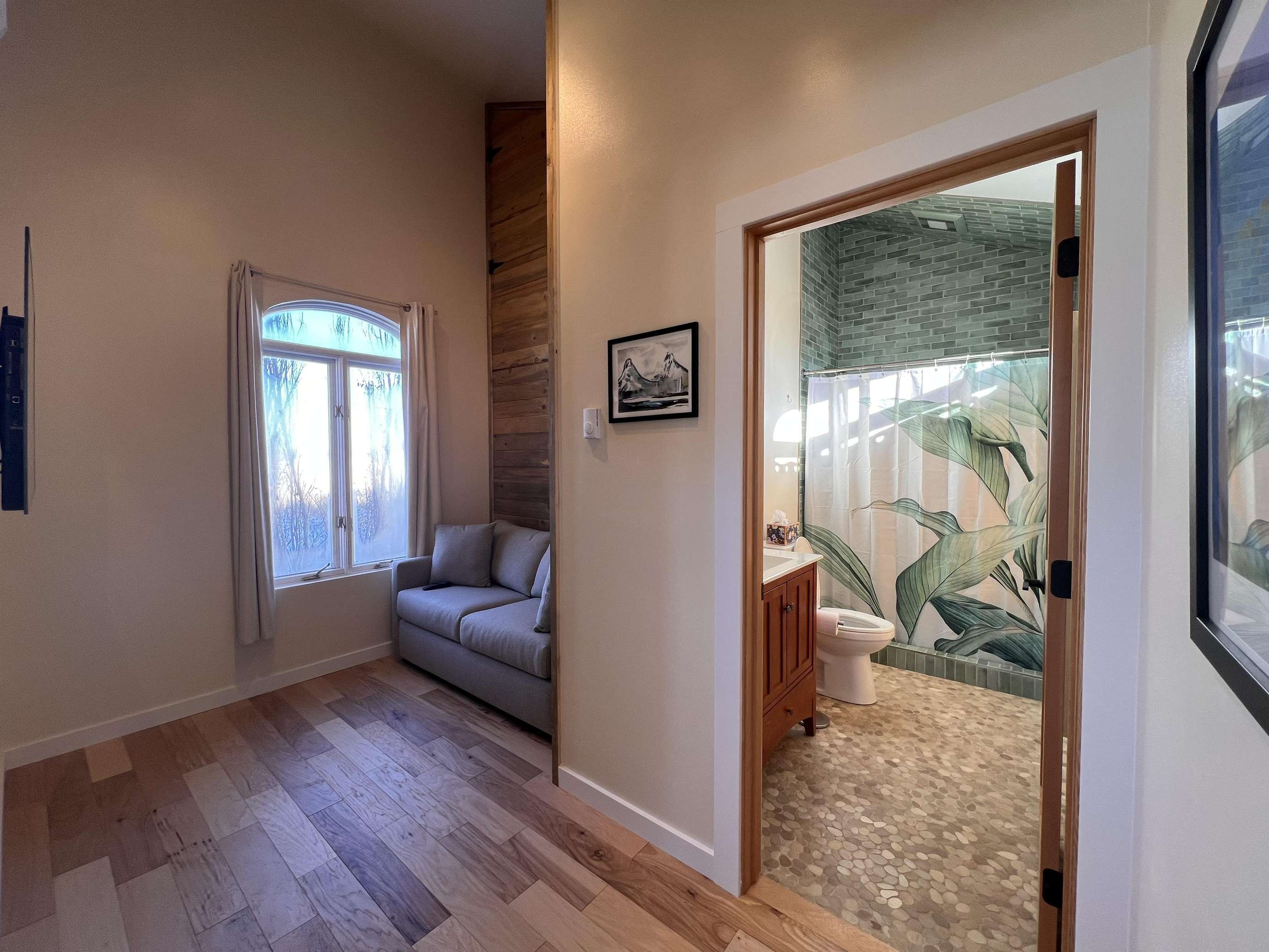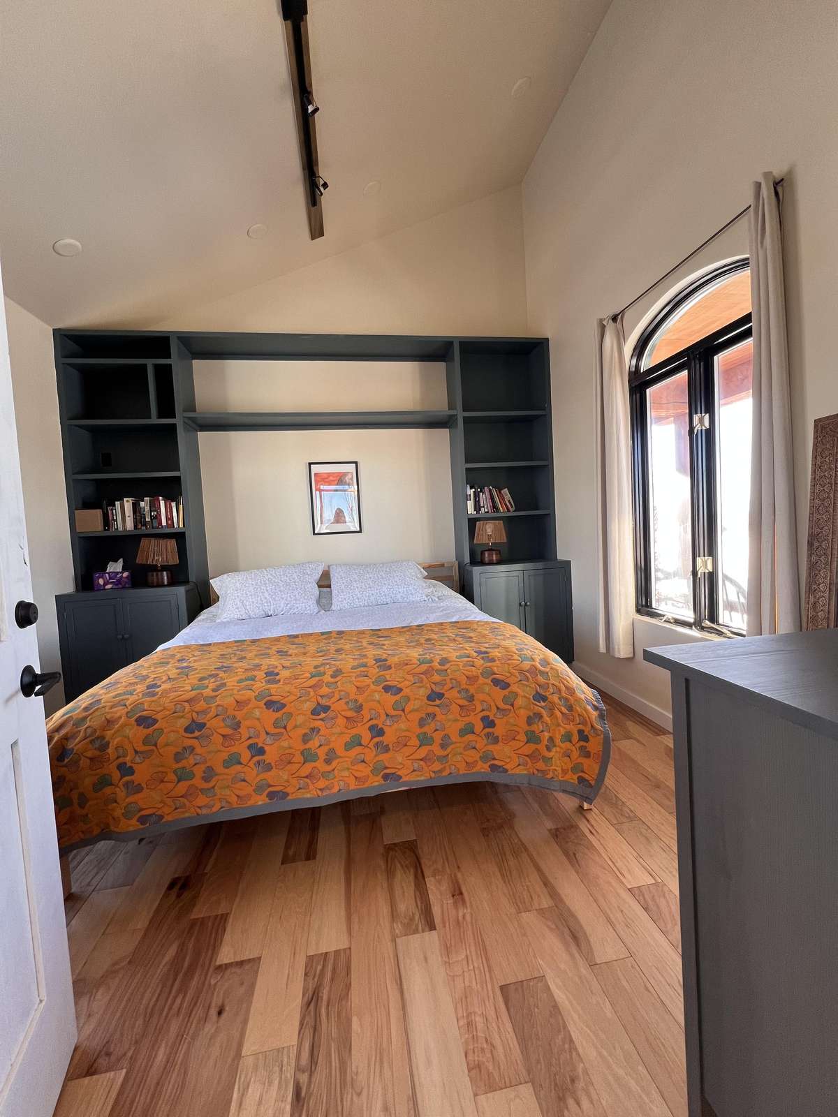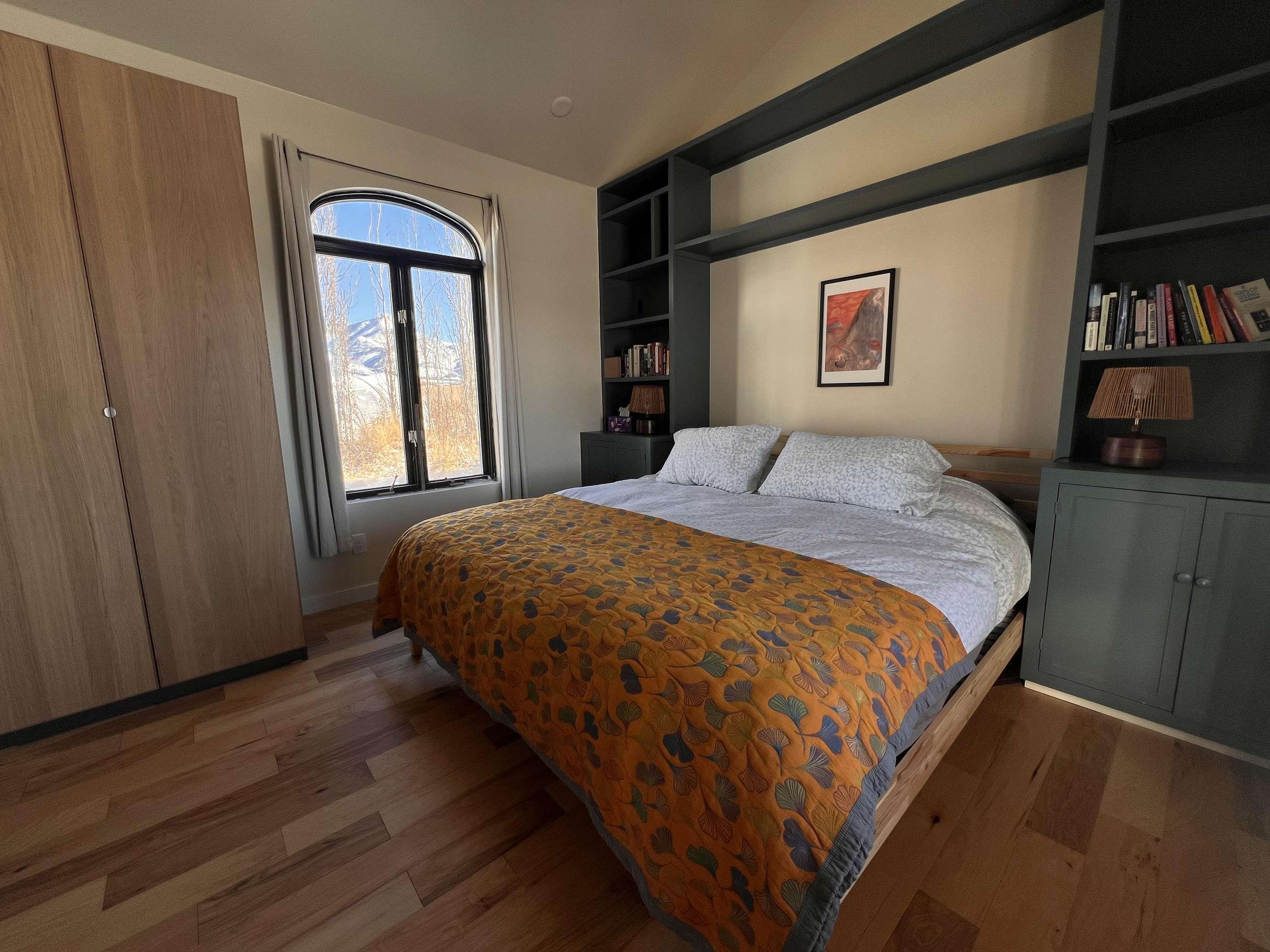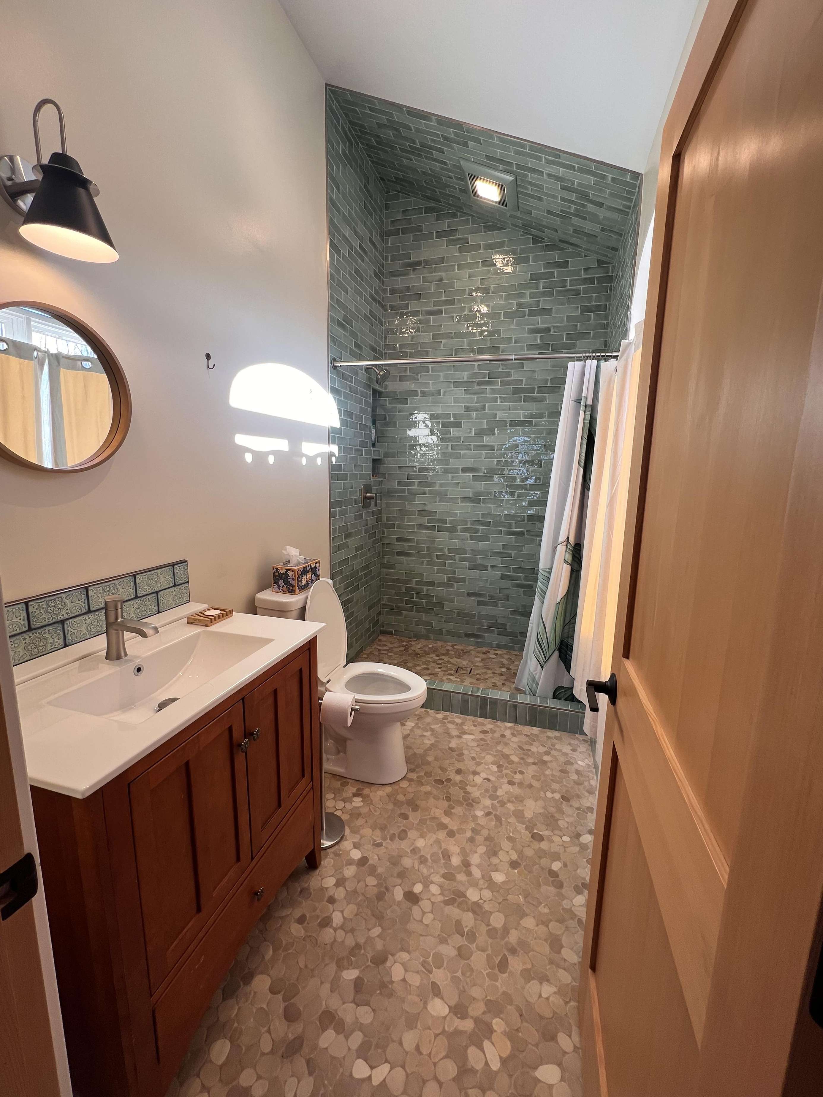 Amenities: Full kitchen, 1 bathroom with shower, 1 bedroom with king bed, large-screen TV with pull-out couch, Wi-Fi, mini-split heating and air conditioning, and a wood stove.